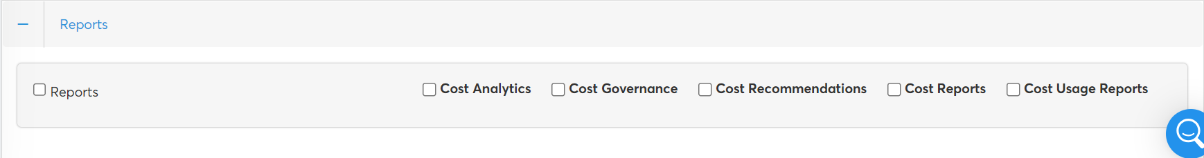 Default Permissions: The Finance role includes default permissions for Orchestration, Governance, Self Service, and Reports.